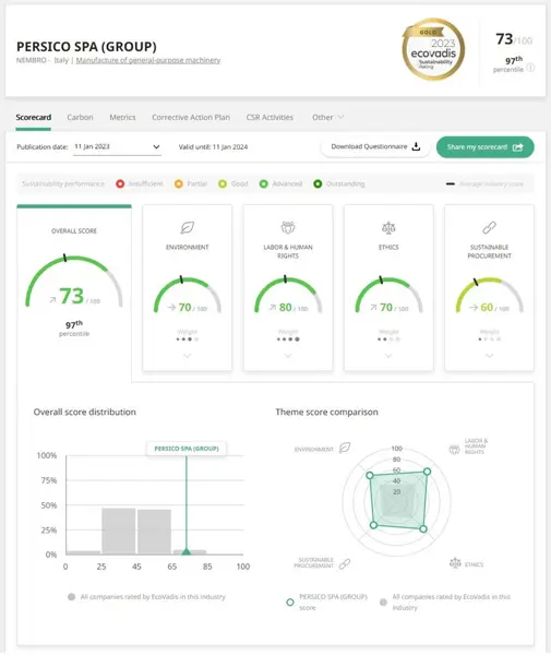 After a lengthy re-evaluation process, PERSICO S.p.A. has been awarded the “Gold” rating, in recognition of its EcoVadis Corporate Social Responsibility (CSR) scorecard, with a score of 73/100 – achieved by just 4% of the companies ranked using this system.